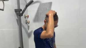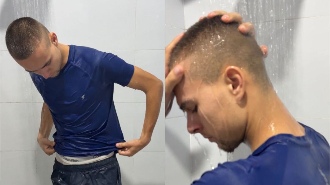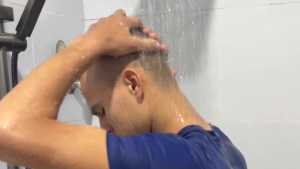 After a workout and getting into the pool, I was soaking wet. With my sports clothes on, I walked trough my hotel to my room. The floor is all wet because of my soaking wet clothes. I took a very hot shower for a long time and I'm showing you how I ever get wetter! I was so hot and sweaty because of my workout. So I'm cleaning myself very good, for you